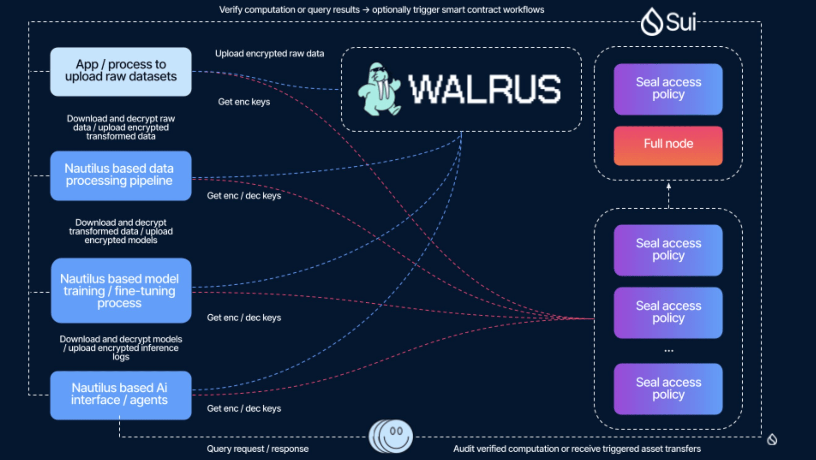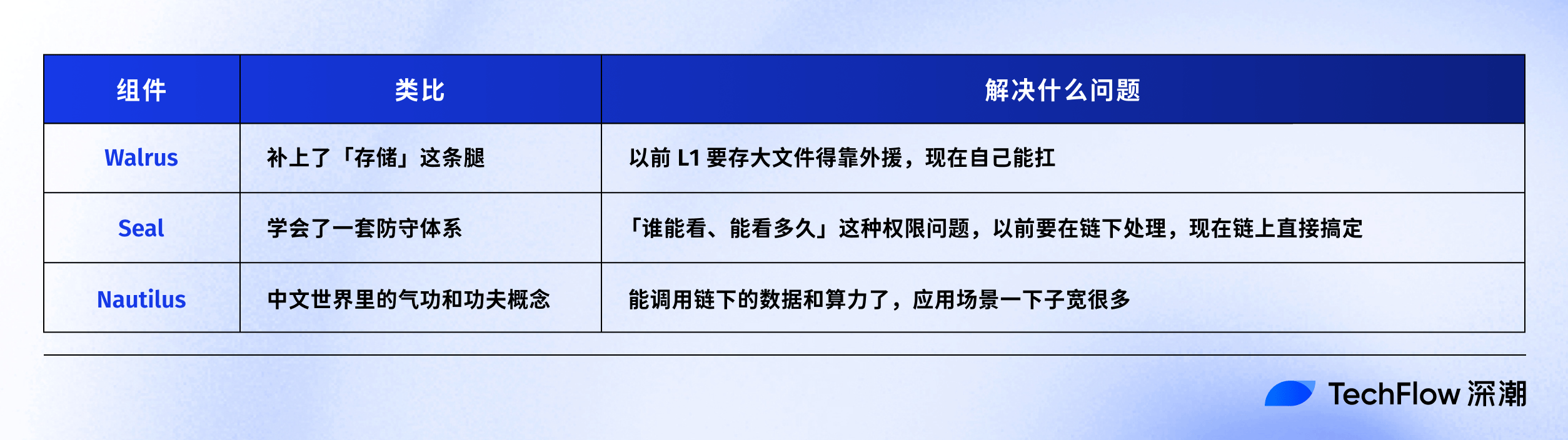 Walrus 是独立的存储层,但和 Sui 共享验证节点;Seal 是独立的权限控制协议,但跑在 Sui 的智能合约里;Nautilus 是独立的链下计算平台,但结果可以被 Sui 原生验证。它们是一个家族,但不是铁板一块。